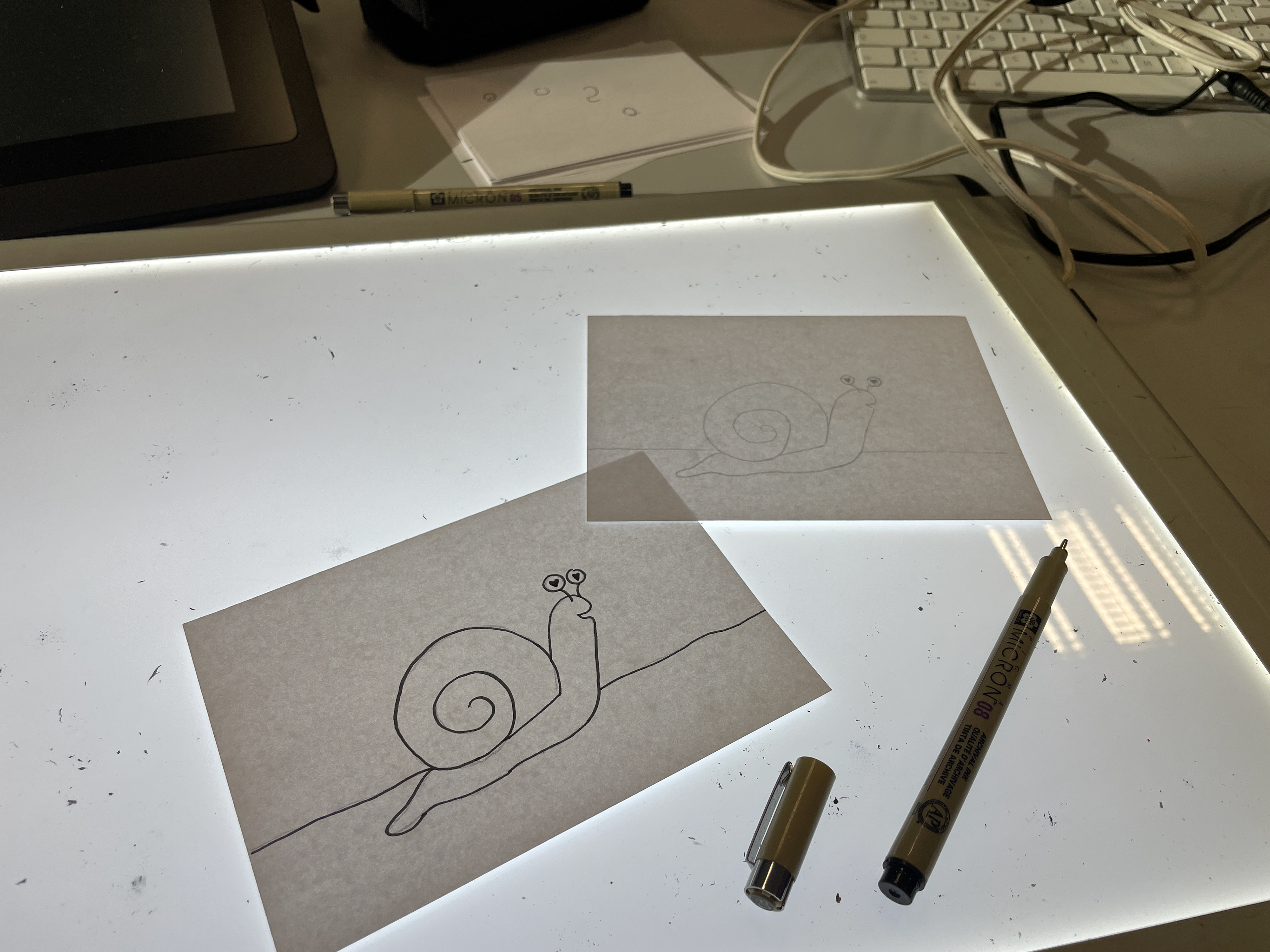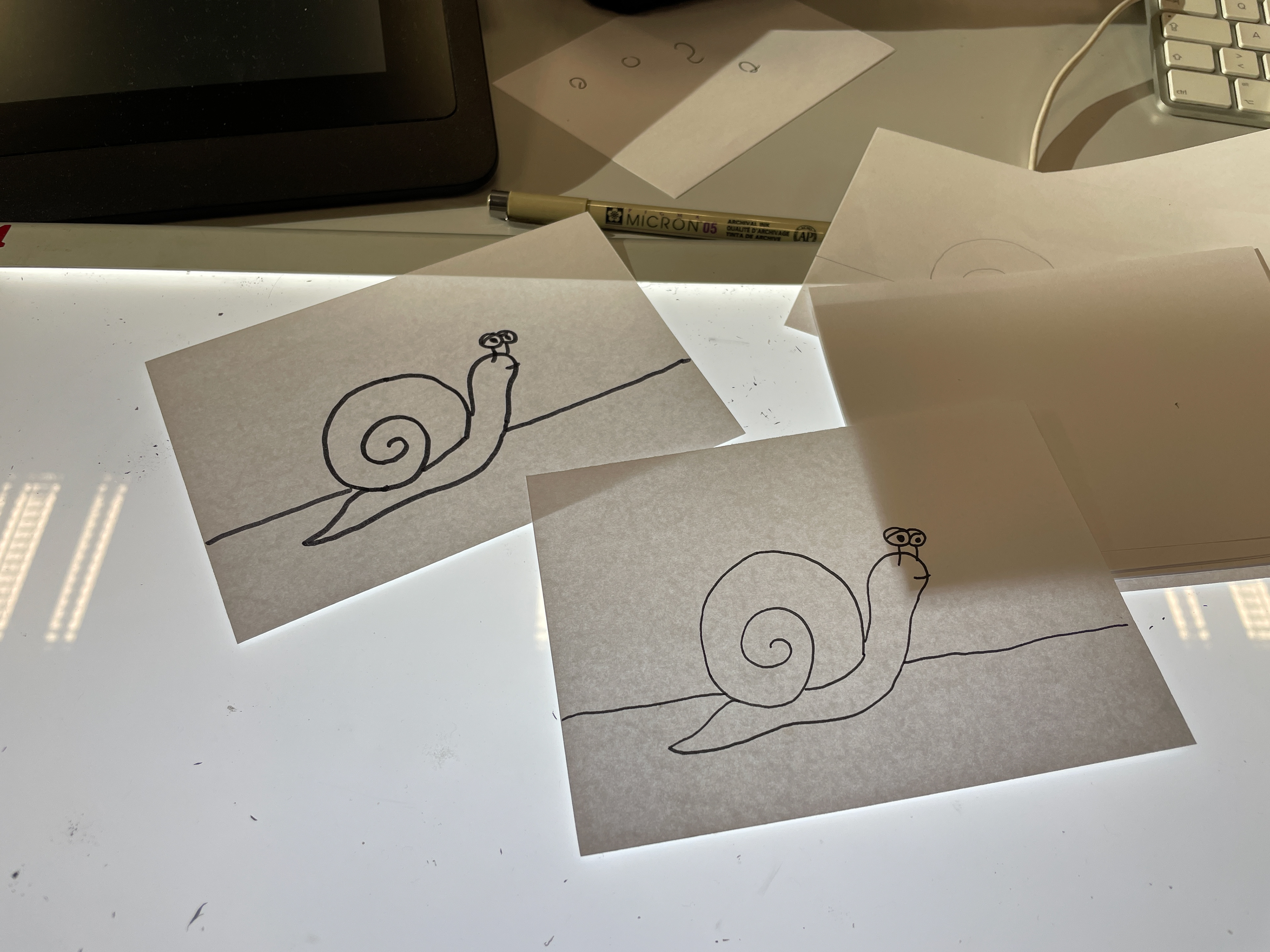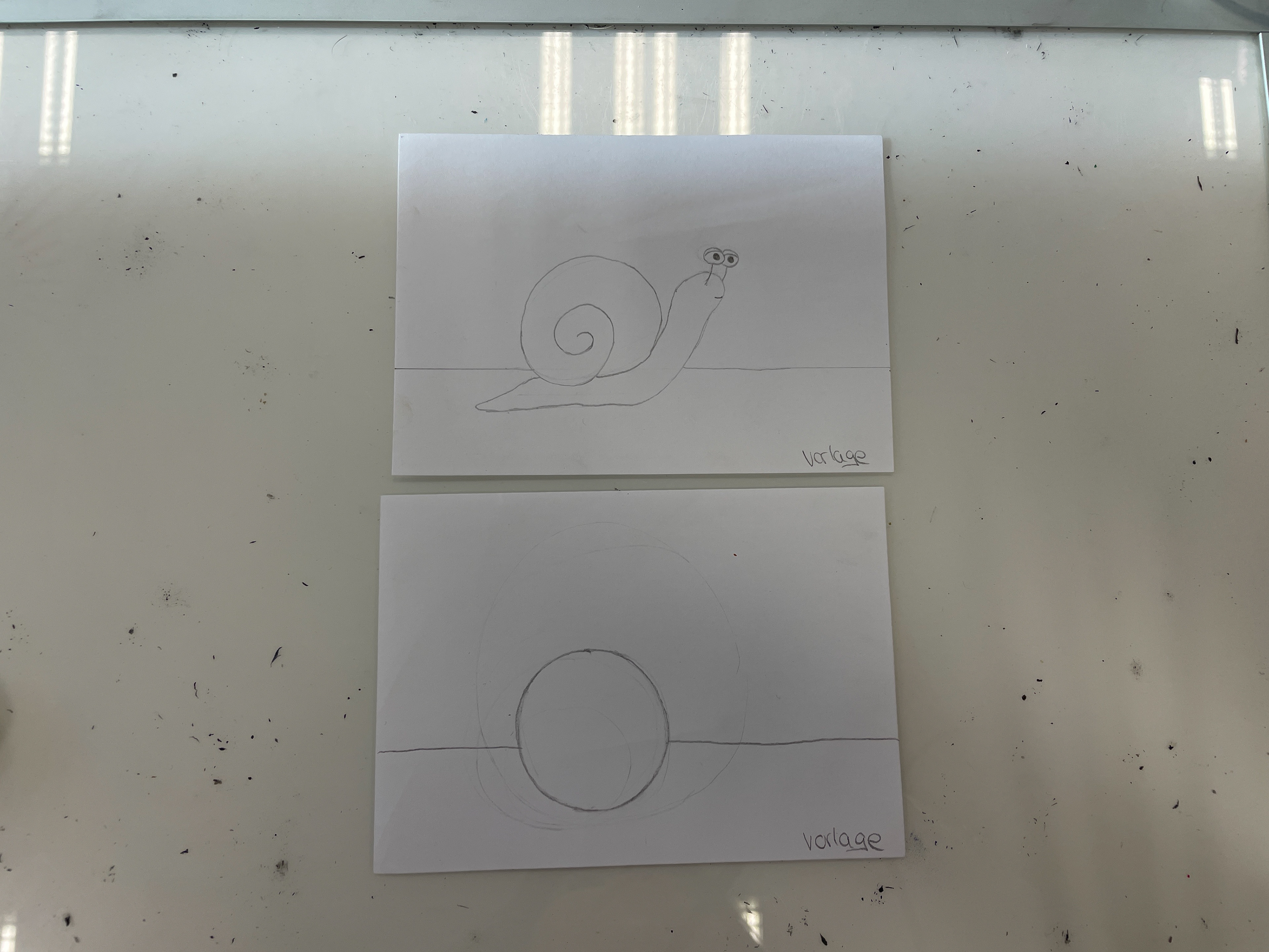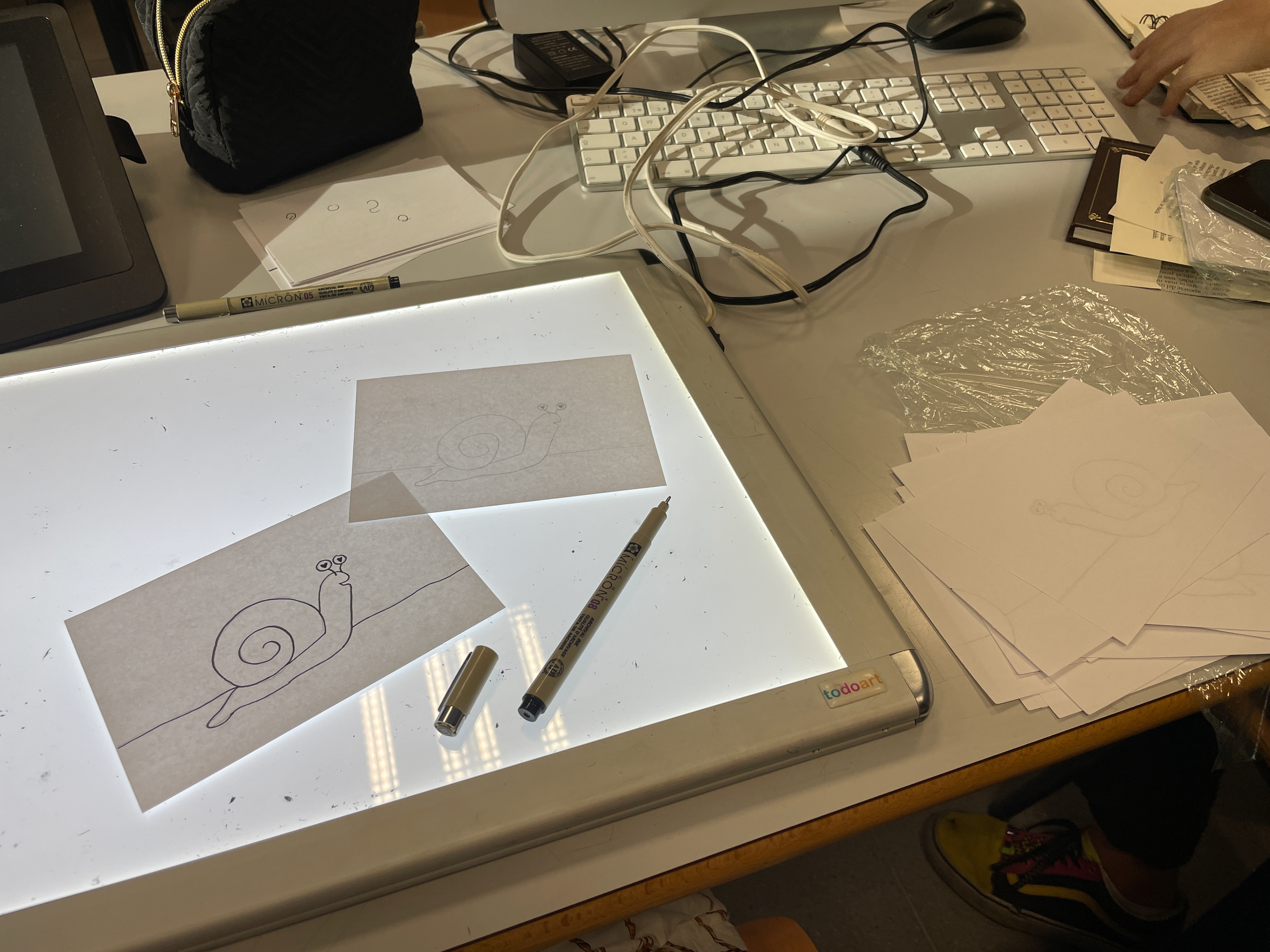 During the drawing process, I had to make some adjustments to my story due to the upcoming group work. These adjustments were to ensure that the transition to Maria's scene would be smooth. As a result, I redesigned the plot. In my revised story, the snail is frightened when the ball appears. After that, however, the snail unexpectedly falls in love with the ball because it is so fast. Finally, the snail Oscar dissolves to allow the transition to the new scene. I used a total of 39 sheets to create this animation. After drawing the basics in pencil, I carefully reworked the drawings with a black pen to bring out the subtleties and details.