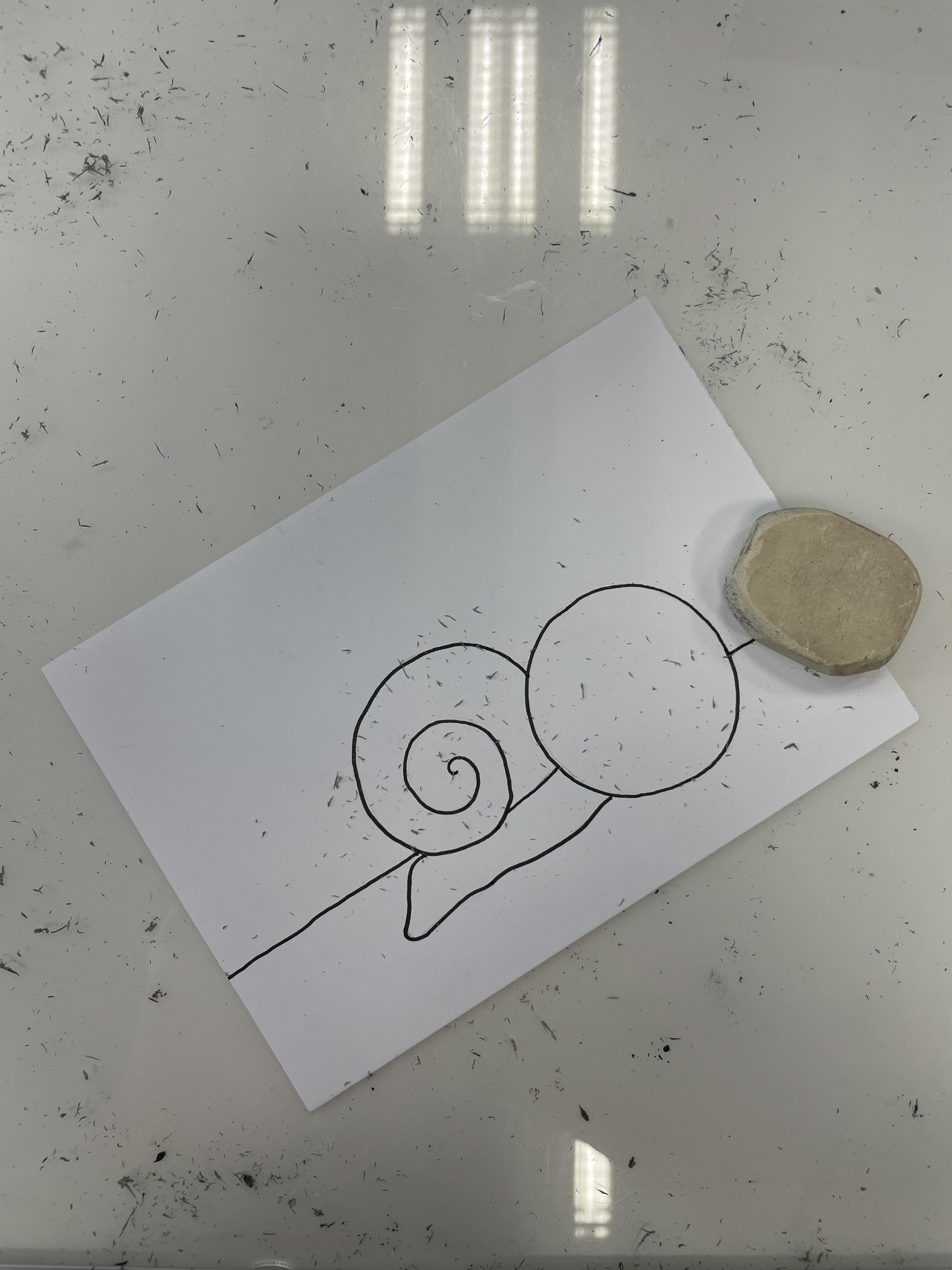 We were given 50 individual sheets to transfer our story to 24 sheets. First I drew two templates for my story, once the snail (Oscar) and the ball. I did this so that while transferring, I would not lose the size and proportions of either one. Finally, I transferred my sketches to these sheets as refined drawings. My utensils were first a pencil and an eraser, in order to be able to still correct mistakes.