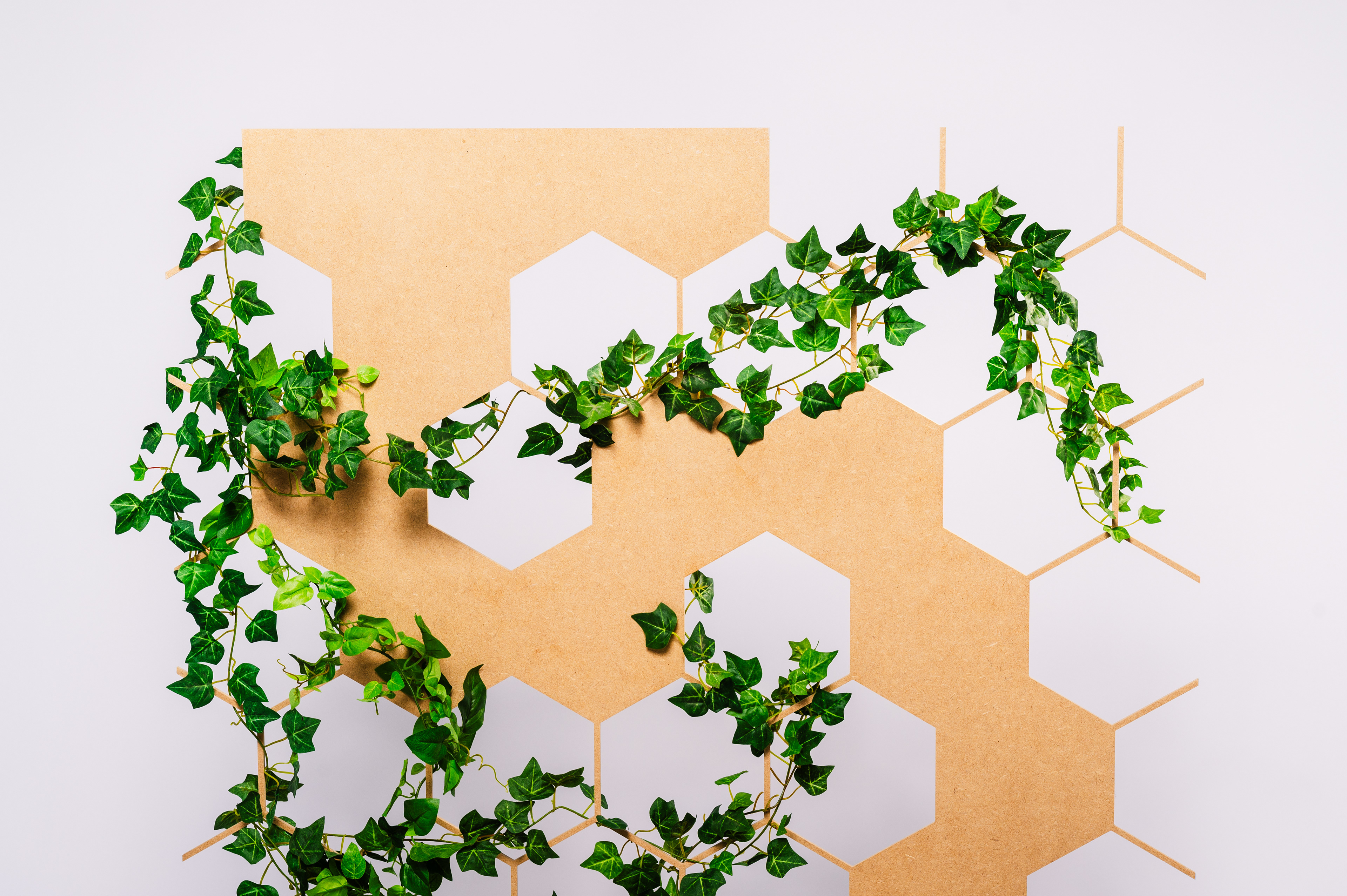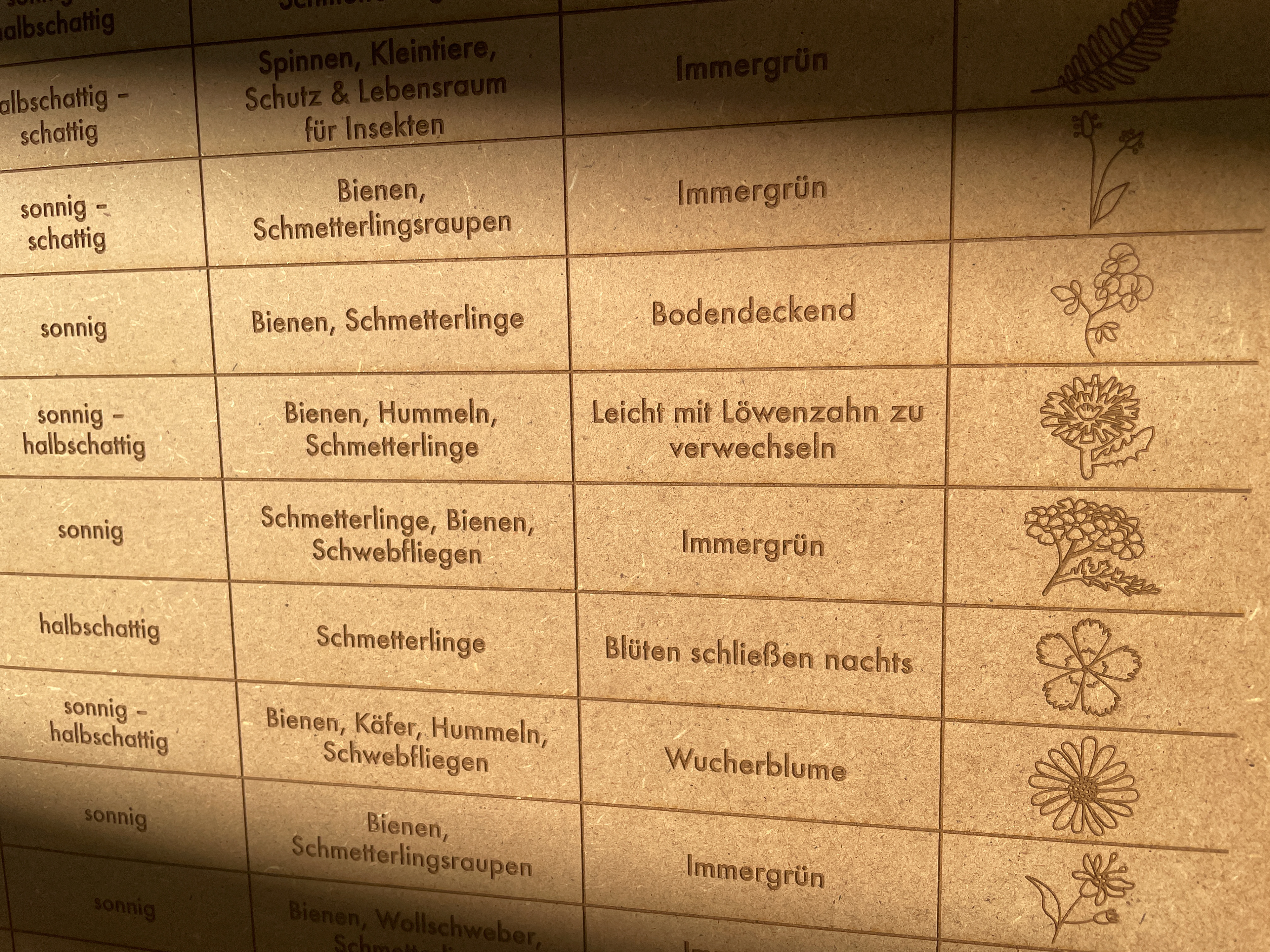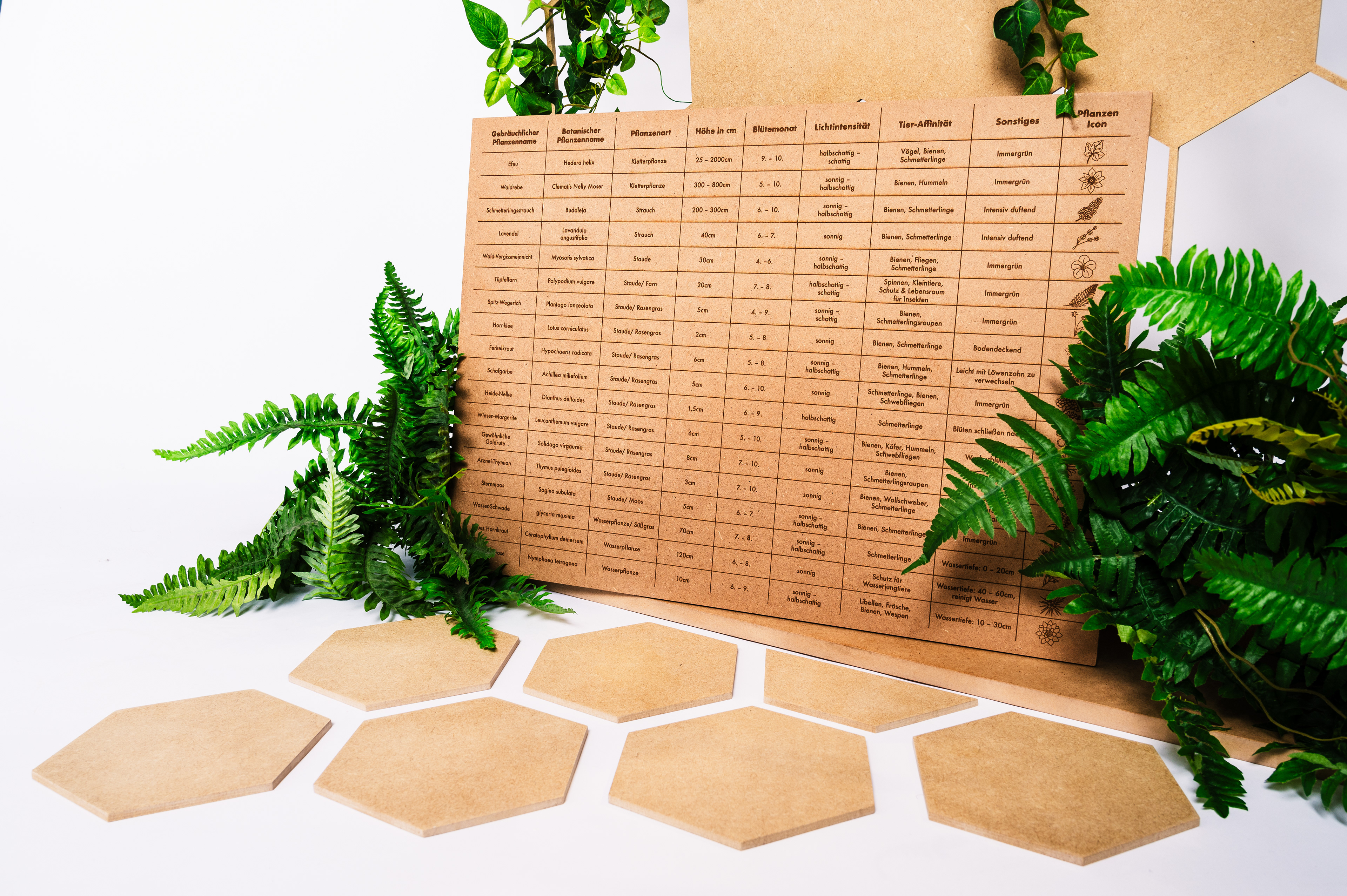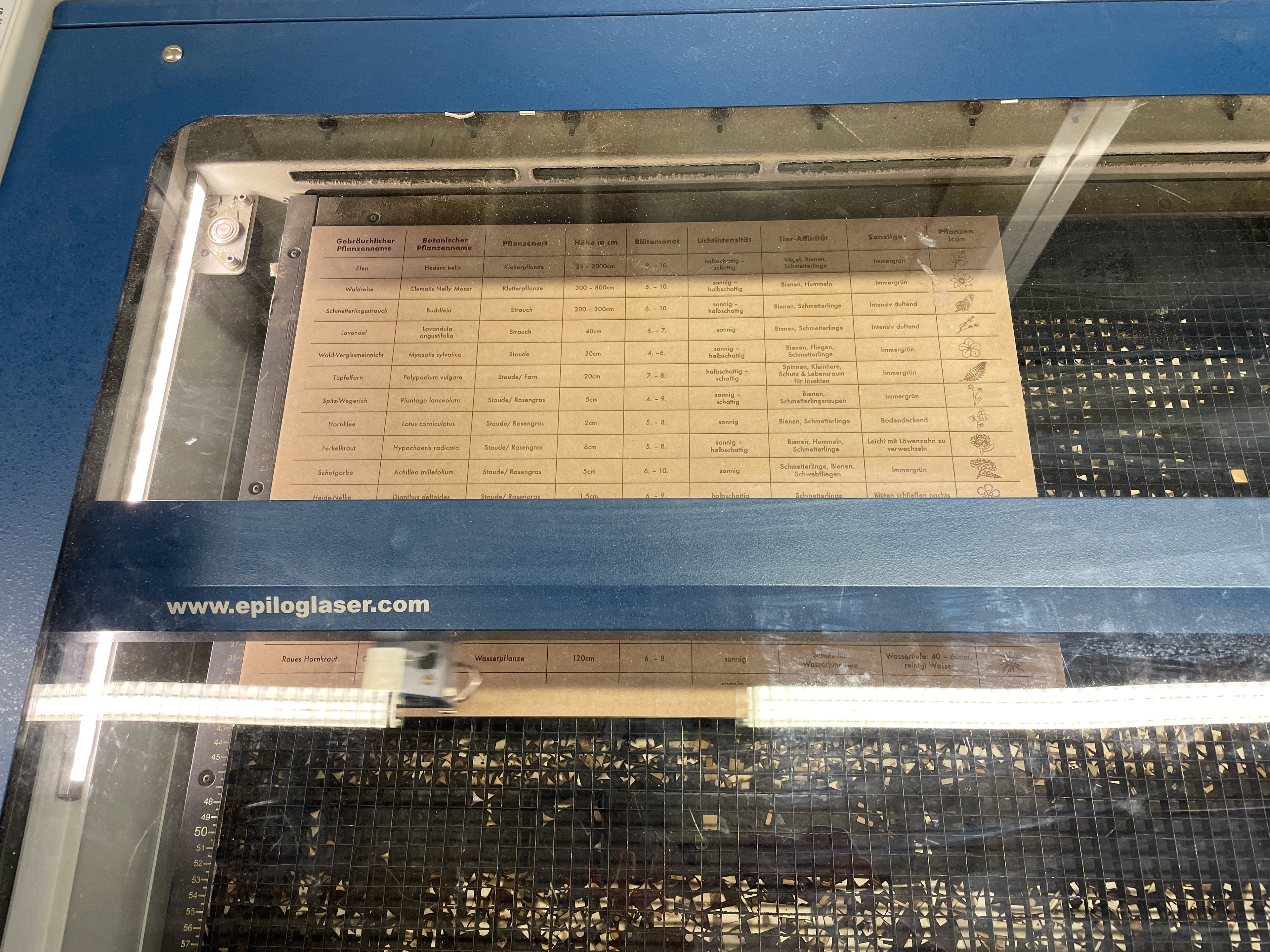 Ich wählte das geschlossene, ornamentartig verzierte Wabengitter einer der sechs Außenwände aus. Wegen der größenmäßigen begrenzten Kapazität der Lasermaschine, konnte ich diese leider nicht in der Originalgröße fertigen. Aus diesem Grund hat das Gitter nur eine Größe von 1 x 1,40 Meter. Einen der Wabensitze konnte ich jedoch originalgetreu nachbauen. Um die Dimension der Grundfläche des Moduls zu zeigen, wählte ich Holzbalken, die ich als einen Rahmen in Originalmaß zusammenlegen kann. Die schon erwähnte Holztafel, auf die ich meine Pflanzentabelle gelasert habe, konnte ich ebenfalls in Originalgröße von DIN A2 produzieren.