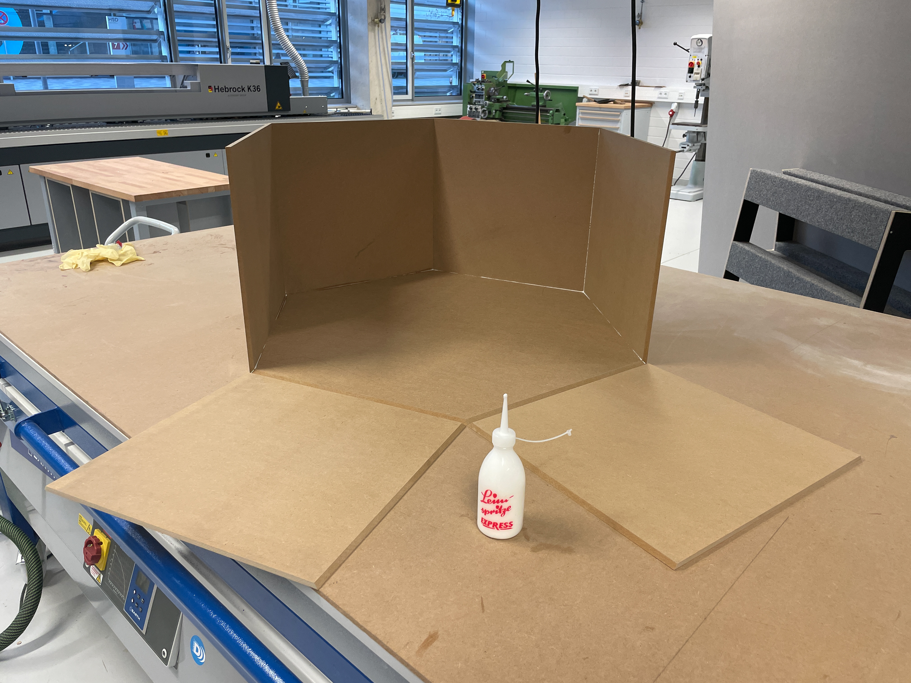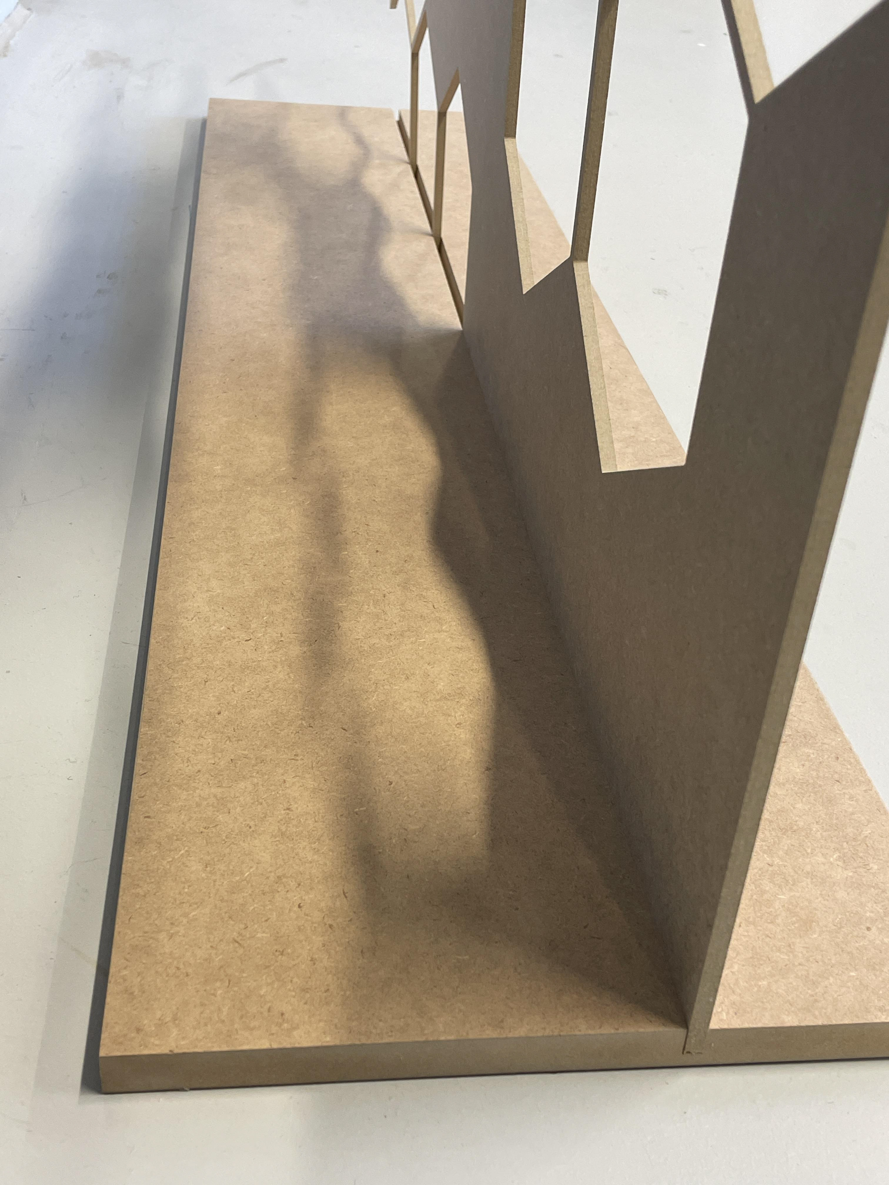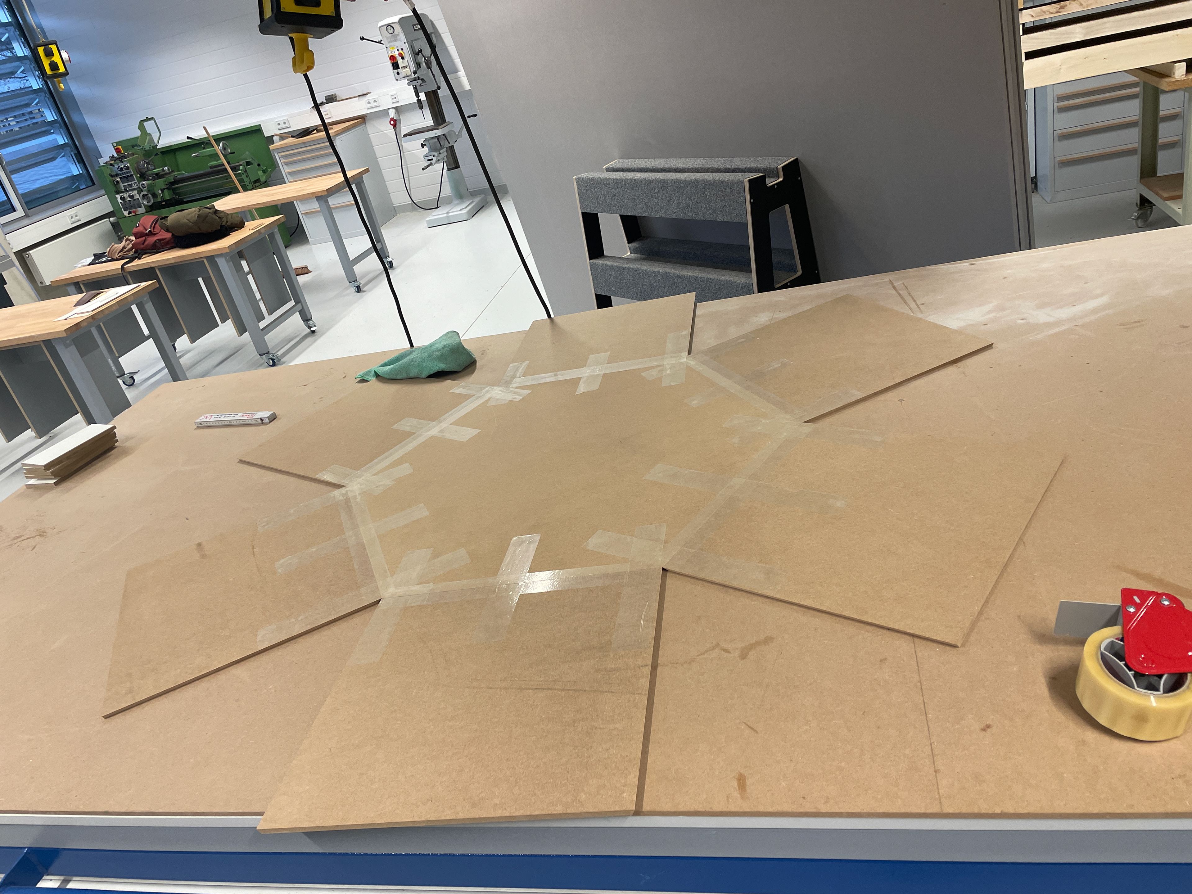 Für der besseren Vorstellung einer konkreten Umsetzung der Module, bei meinem Kolloquium, habe ich Teilelemente in der Holzwerkstatt, unter der Aufsicht von Dennis Golly, angefertigt. Insgesamt habe ich, drei Tage lang, vier Elemente aus MDF-Platten ausgesägt, maschinell ausgelasert und per Hand geleimt.