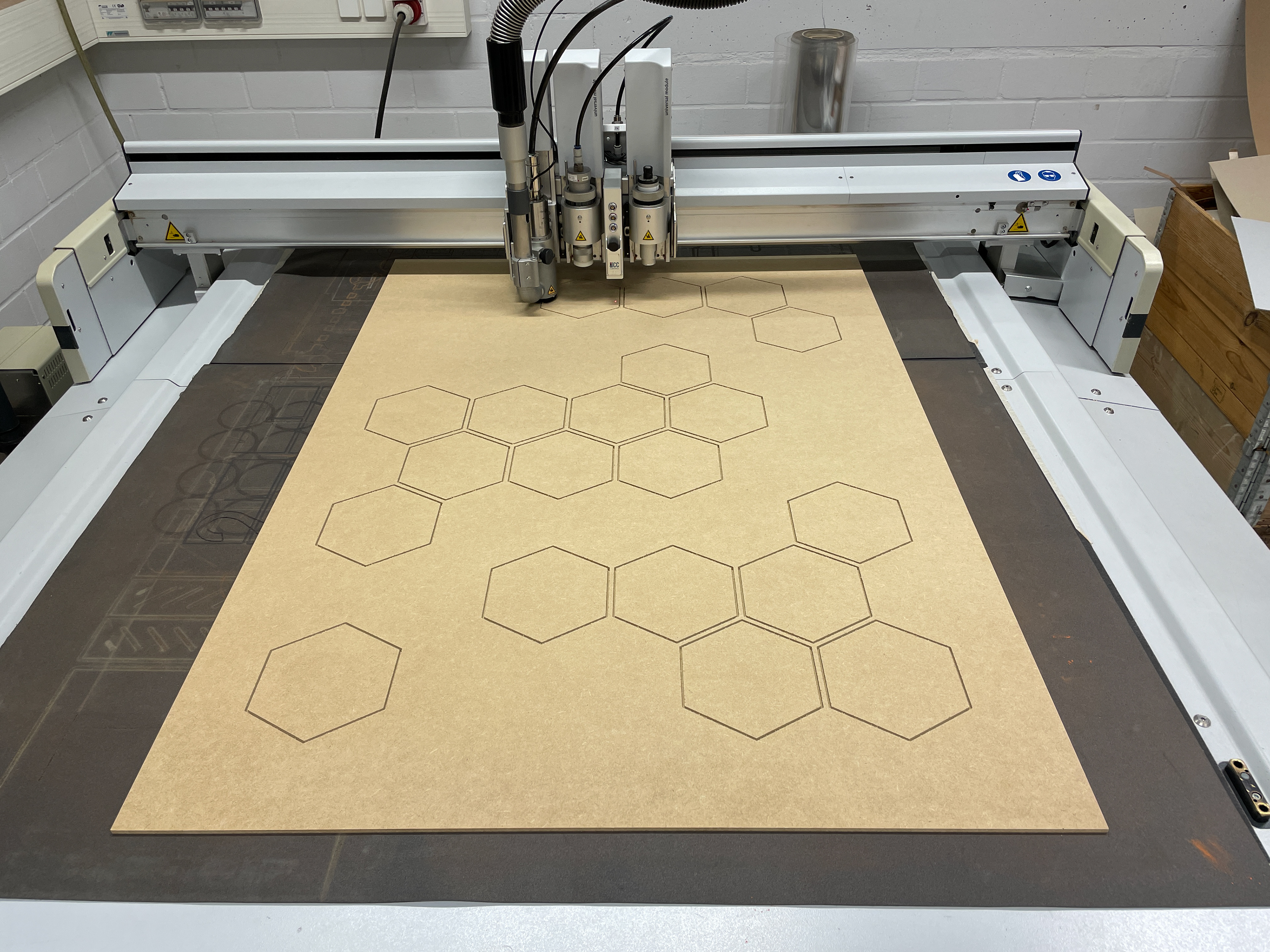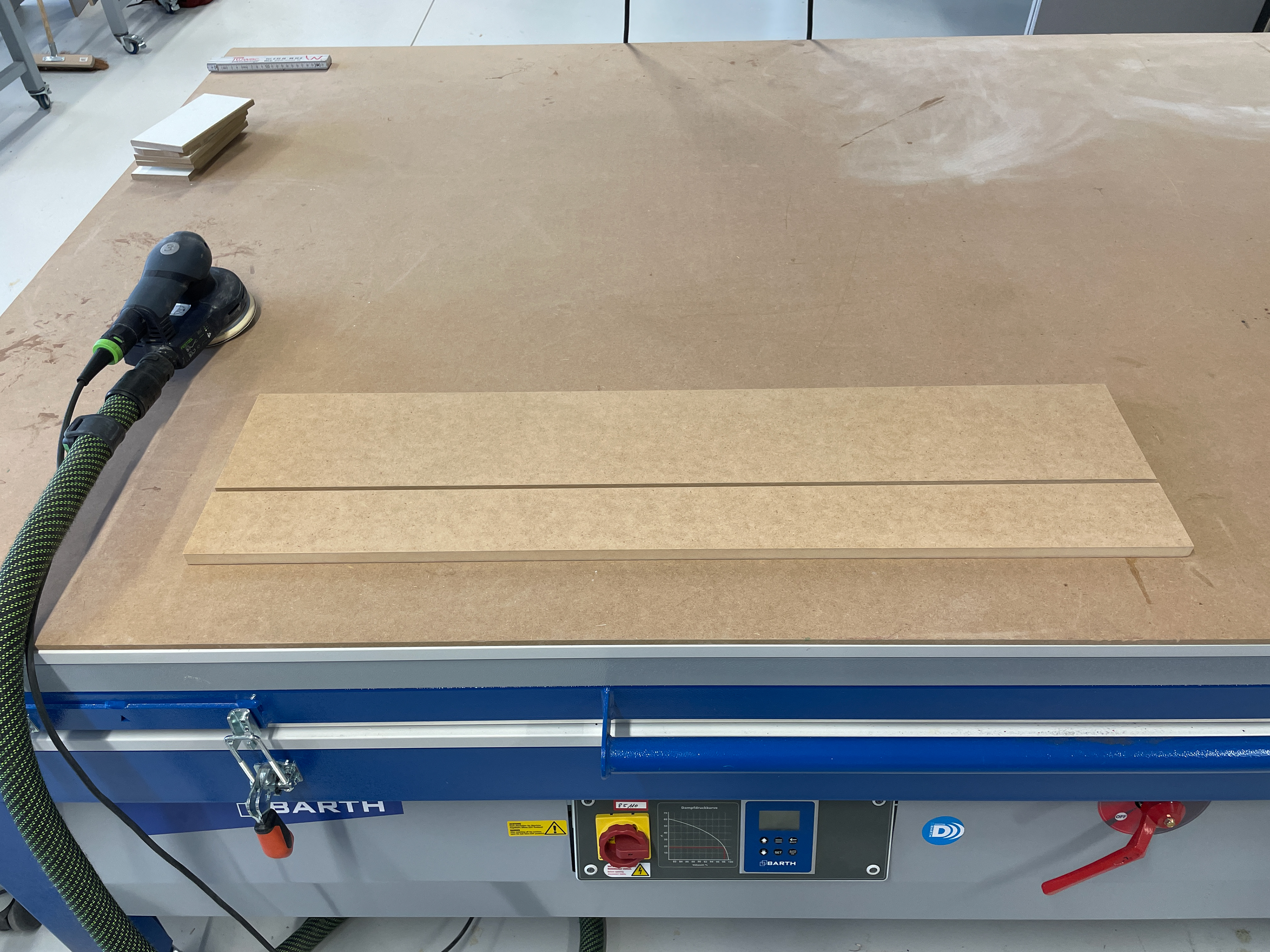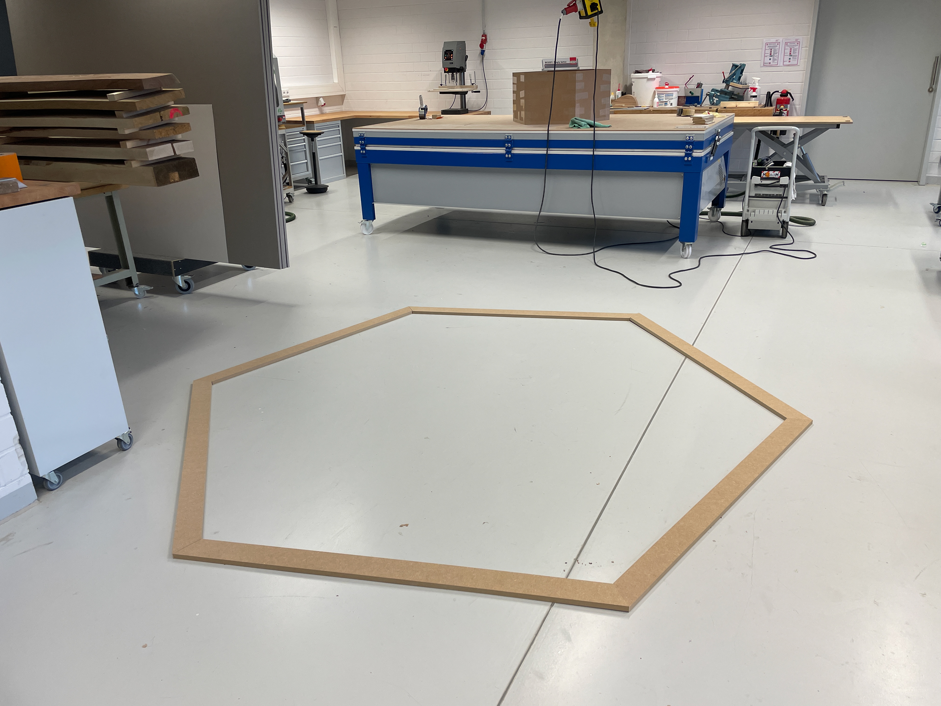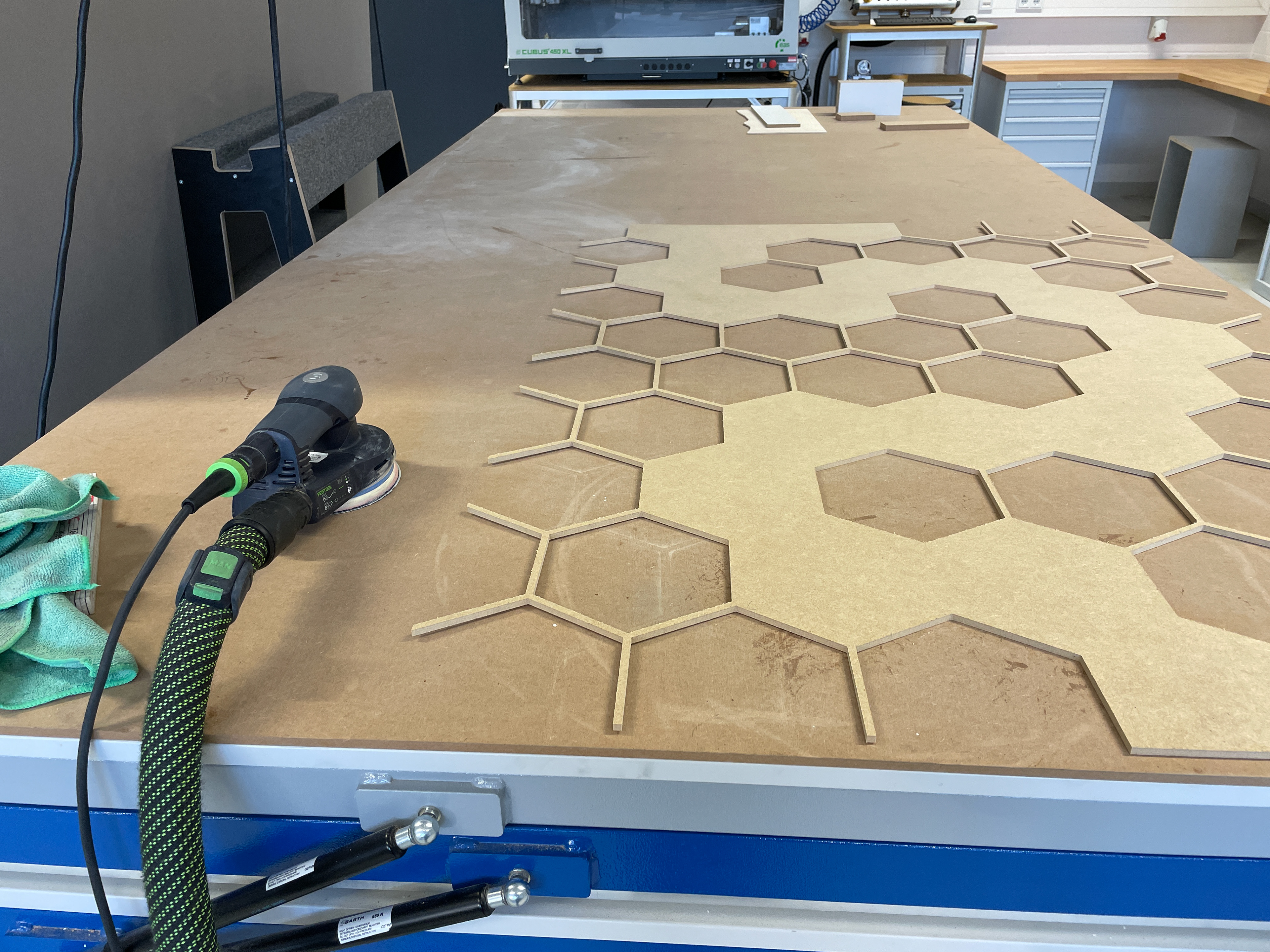 Für der besseren Vorstellung einer konkreten Umsetzung der Module, bei meinem Kolloquium, habe ich Teilelemente in der Holzwerkstatt, unter der Aufsicht von Dennis Golly, angefertigt. Insgesamt habe ich, drei Tage lang, vier Elemente aus MDF-Platten ausgesägt, maschinell ausgelasert und per Hand geleimt.