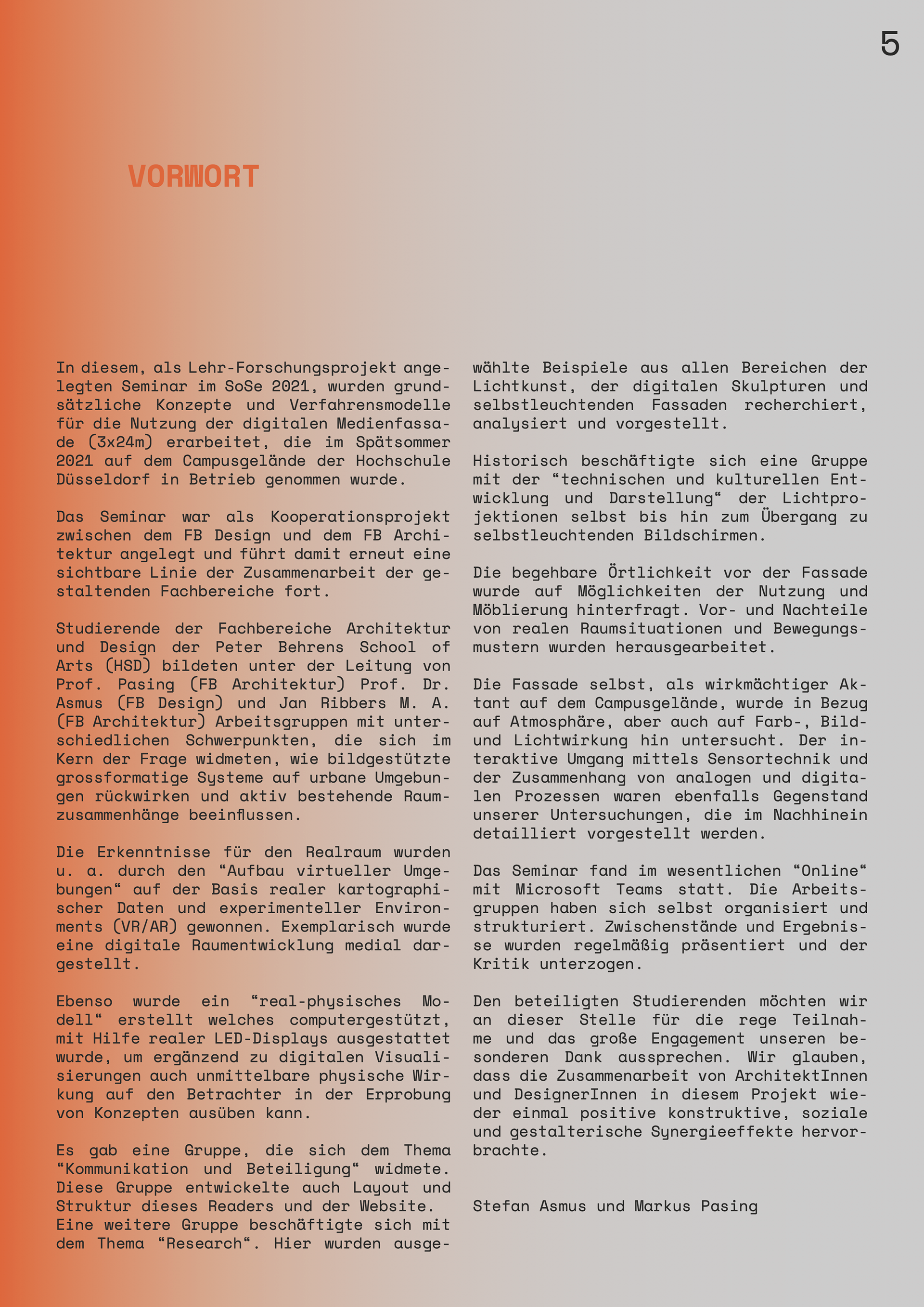 In diesem, als Lehr-Forschungsprojekt angelegten Seminar im SoSe 2021, wurden grundsätzliche Konzepte und Verfahrensmodelle für die Nutzung der digitalen Medienfassade (3x24m) erarbeitet, die im Spätsommer 2021 auf dem Campusgelände der Hochschule Düsseldorf in Betrieb genommen wurde.